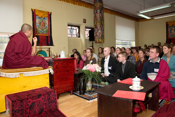 H.E. Mindrolling Jetsün Khandro Rinpoche giving a teaching to a room full of listeners